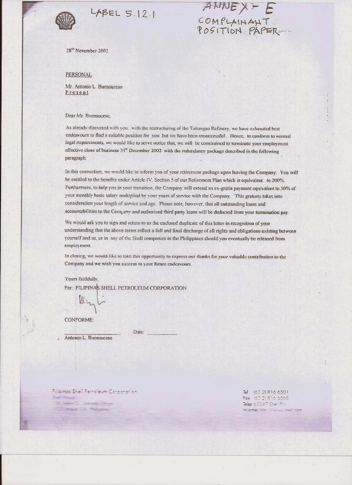 In fact if there was really redundancy, meaning there are excess operators more than the business needs, Mr. Bersamin should have automatically released me on December 31, 2002 as he said on his letter to dated November 28, 2002 and should have not requested me to stay for another month and a half until February 15, 2003.