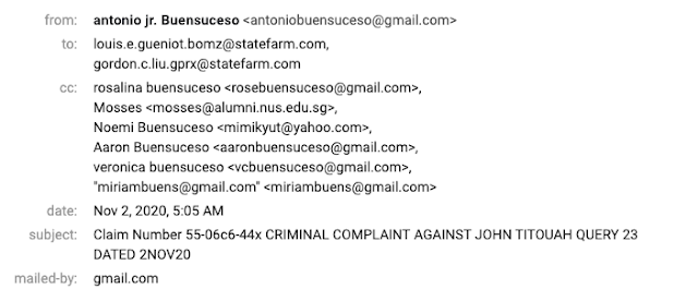 SO, MR. GUENIOT, AGAIN, MAY I REQUEST FOR YOUR KIND UNDERSTANDING. WE NEED TO HAVE OUR NEGOTIATION ORGANIZED AND RECORDS CLEAR, SO THAT WE MAY AVOID CONFUSION. OBVIOUSLY, IT APPEARS THAT YOU WANTED MUCH EAGERLY TO CLOSE THE NEGOTIATION AND THE INVESTIGATION PROCESS. HOWEVER, YOUR EFFORTS ARE IN VAIN AS I SEE YOUR INAPPROPRIATE RESPONSES NOW ARE WANING TO ONLY FEW OR THREE (3) WEAK, SENILE AND FEEBLE PARAGRAPHS AND THUS, SIMPLY THIS FACT LEAD ME TO THINK YOU REALLY JUST WANTED TO AVOID QUESTIONS, WHICH ANSWERS OR NO ANSWER FROM YOU TEND TO SPILL THE BEANS OF MOST PROBABLY TITOUAH AND YOUR CRIMES IN PARTNERSHIP WITH HIM SIMPLY BY READING THE QUERIES SPECIALLY CRAFTED FOR YOU, WITH OR WITHOUT YOUR ANSWERS. AND THIS TIME YOU FAILED AND/OR REFUSED TO ADD: The one year “Suit Against Us” time period referred to in the May 6, 2020 letter includes the time period from the date of loss (April 26, 2020) to the date the claim was reported to State Farm (April 29, 2020). The one year time period was tolled during our investigation of this claim (April 29, 2020) to the date the claim was initially denied (May 6, 2020). The one year time period was tolled upon receipt of Antonio Buensuceso Jr.’s email dated May 29, 2020 for additional investigation until the date the denial of the claim was confirm in our June 12, 2020 letter. That one year time period continues to run as of the date of our June 12, 2020 letter. IF THIS WAS NOT INTENDED THEN PLEASE ADD THIS TO YOUR SUBSEQUENT RESPONSE.
